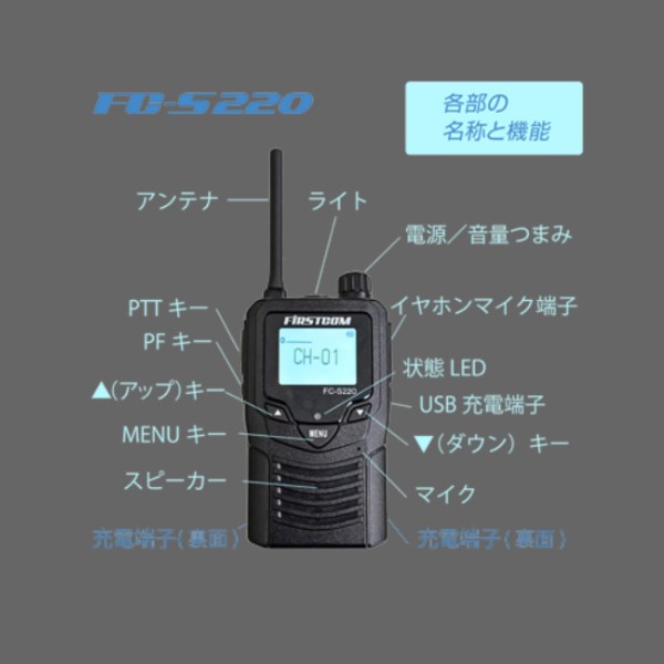 FC-S220 は、9ch機・11ch機・20ch機のトランシーバーと通話することが可能な、2台セットの特定小電力トランシーバーです。